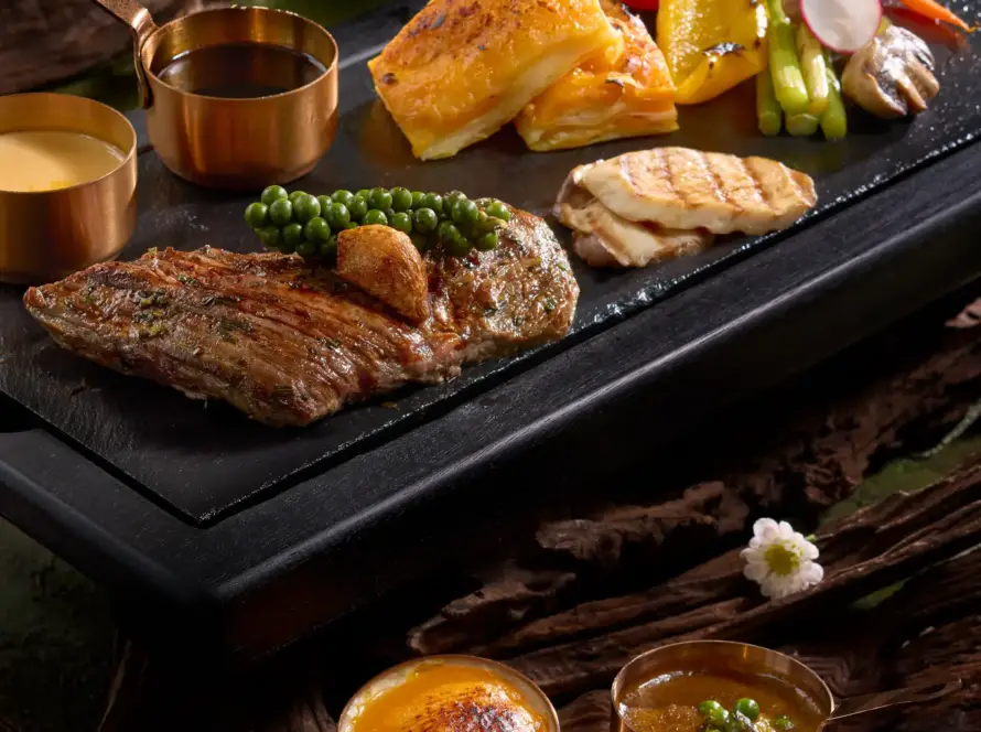 Pork Jowl, Chuck Fat Iron, Beef Boneless Flank, Tenderloin Served with Pickled Vegetables & Grilled Baby Corn, Truffle Parmesan Fries with Wild Mushrooms, Chimichurri Sauce, BBQ Sauce, Peppercorn Sauce.